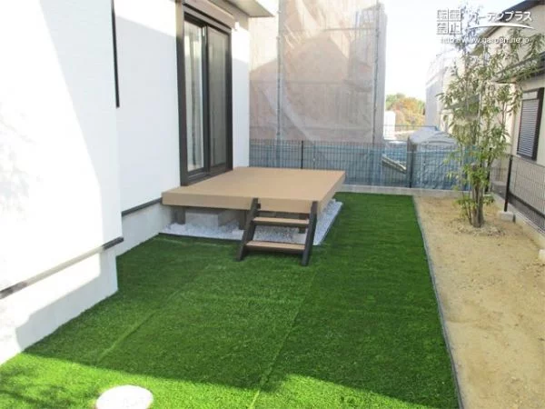 新築のお住まいのお庭工事をご依頼いただきました。広いお庭でしたが、土のままの状態だったため、まずは雑草や水たまりに悩まされないように防草シートを敷き、人工芝で覆いました。新築時に植えられた庭木のまわりは見切り材で囲って植栽スペースとして残しています。気軽にお庭と行き来できるよう、掃き出し窓の前には人工木のウッドデッキを設置。清潔でお手入れしやすく、お子様が走り回って遊べるお庭です。