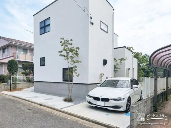 外壁の白に植栽の緑が映える爽やかな外構