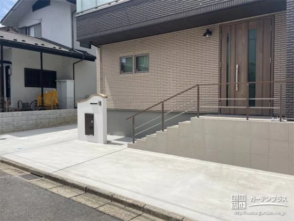 新築のお住まいに合わせ、洗練されたモダン外構を施工しました。シックなグレーの外観に調和するよう、門柱には高級感のあるタイル仕上げを採用し、隣に枕木材を配置することでデザイン性を向上。玄関ポーチのステップには浮き階段を取り入れ、重厚感と上質な雰囲気を演出しました。道路と玄関の距離が近い立地ながら、目隠し効果と奥行きを感じさせる工夫を施し、機能性とデザイン性を兼ね備えた外構に仕上げています。