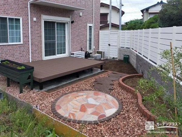 新築のお住まいの外構工事をご依頼いただきました。敷地の前後が道路に接していましたので、お庭側の境界にはメッシュフェンスを設置。大きなウッドデッキを取り付けたお庭で、のびのびと遊んでいただけます。玄関側は使いやすいように全面土間コンクリートを打設しました。またお客様からお住まいに合わせた色味の門柱やポストをご支給いただき、ポーチ階段の脇に設置。可愛らしいデザインエクステリアがお住まいの目印となってくれます。