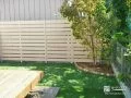 植栽にあわせた人工芝と木調目隠しフェンスの明るいお庭