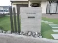 新築のお住まいの外構工事をご依頼いただきました。駐車スぺースには横に4台分並べて停められる広さの土間コンクリートを打設。その分アプローチは玄関周りだけとなりましたが、存在感のある幅広の門柱や乱形石により、上品で奥行きのあるエントランスを設計しました。ダークカラーのモダンな建物が引き立つように、淡い色合いや明るい木目調カラーを組み合わせた新築外構です。