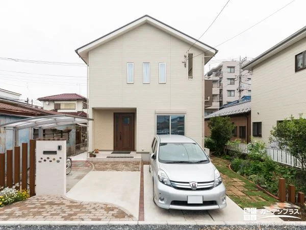 アプローチにはインターロッキングを敷設。曲線で表現された柔らかな印象にのアプローチは雨水が溜まらず、雨上がりの日も快適に歩行できます。駐車スペースの土間コンクリートと合わせて、足運びの良い機能的な仕上がりとなりました。