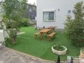 主庭に防草シートと人工芝を敷設しました。建物周りは防草シートと淡いクリーム色の洋風砕石砂利を敷設。雑草対策と防犯対策に役立ちます。犬走りには植物の水やりをする際等に便利にお使いいただけるよう、立水栓とガーデンパンを取り付けました。周辺の街並みとも調和し、心安らげる緑豊かなナチュラルテイストのお庭に仕上がりました。