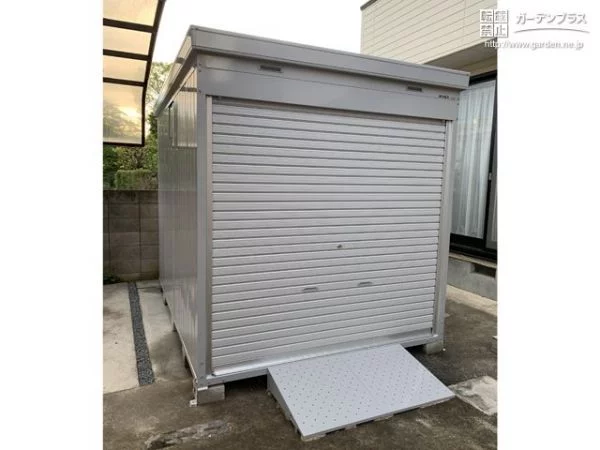 バイクガレージの設置を承りました。既存の植栽スペースの庭木を撤去し、土間コンクリートを打設して床面を舗装。その上にバイクガレージを設置しています。シャッターやワイヤーロックバーなど、豊富なオプションから必要なものをカスタマイズできるガレージです。