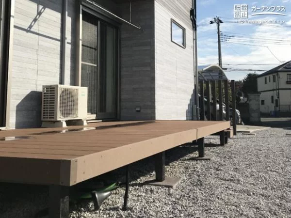 ご自分でデッキを設置されていたテラスですが、よりしっかりしたリウッドデッキ200を施工させていただきました。雨や紫外線を除けるテラス屋根も施工し、急な雨でも濡れないテラスに。お庭づくりの際には、室内と出入りしたり休憩をしたりと便利なスペースとしてご利用いただけます。