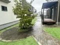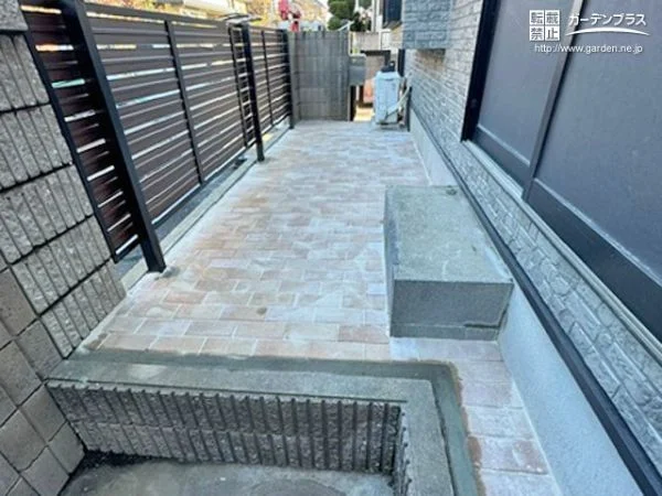建売の戸建住宅を購入されたお客様から、お庭スペースの舗装工事をご依頼いただきました。道路に面したところでしたので、メンテナンスがしやすく清潔に使えるようにインターロッキング舗装をご提案。明るいグレーのブロックを使ってお住まいに合わせたモダンなテラスに仕上げました。また安全対策として、お庭の正面には目隠しフェンス、側面にはメッシュフェンスを設置しています。安心して清潔に利用できるお庭となりました。