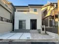 新築外構一式を承りました。駐車スペースはお客様のご希望で、ファミリーカー1台と自転車3台が置けるようにしたいとのことでしたので、全面土間コンクリートで舗装し、頭上にカーポートを設置。カーポートは、見た目もすっきりモダンな、奥行きに幅をもたせた延長タイプをお選びいただきました。またエントランスとなる機能門柱は宅配ボックス付きですので不在時も安心です。さらに隣接する掃き出し窓前は道路との距離が近いことから、塀や目隠しフェンスで境界を明示化。フェンス基礎ブロックにはタイルをあしらい、高級感のある仕上がりがお住まいを引き立てました。シックなお色味で統一感のあるモダンな仕上がりです。