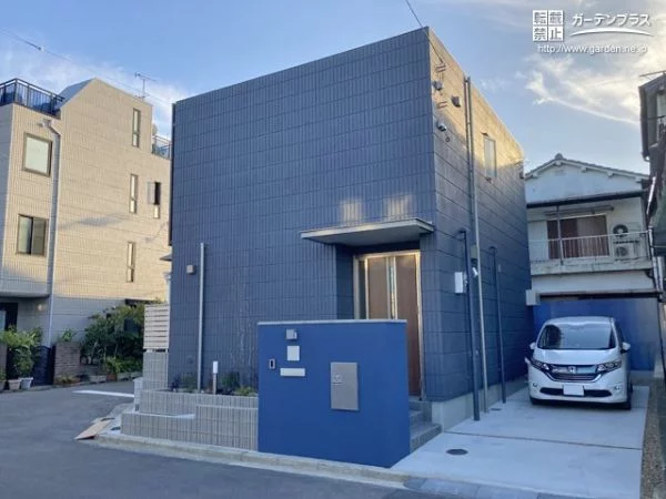 建物とマッチしたブルーカラーの門柱がスタイリッシュな新築外構