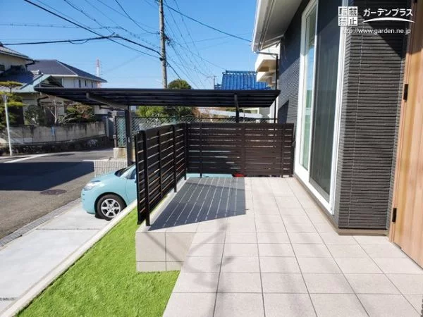 "お庭を愛犬がのびのび遊べるドッグランにしたい"とお客様から、リフォーム工事をご依頼いただきました。オープンだったお庭と駐車スペースの間に、目隠しフェンスや門扉をレイアウト。さらに犬走り部分にも門扉を設置したことで、ワンちゃんがのびのび遊べるクローズのお庭になりました。またお庭は、ワンちゃんの足に優しい、柔らかな人工芝で整え、一画をコンクリートテラスに。テラスでは火気を扱うBBQが楽しめます。掃き出し窓前にはウッドデッキやテラス屋根を設置し、くつろぎのスペースも確保しました。プライベートスペースを確立させたことで、ご家族みんなで楽しめるお庭が完成です。