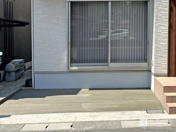 玄関ポーチ前に土間コンクリートを打設しました。段差まわりの凸凹をなくし、足元が安定して歩きやすいアプローチに。雨の日でも泥はねしにくく、見た目もすっきりと清潔感のある印象になりました。毎日通る玄関周りが整うことで、お住まい全体がより快適に感じられます。