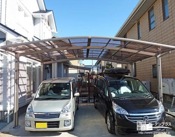 施工前は1台分のスペースが舗装されていました。奥側のスペースを追加で2台分舗装し、壁付けタイプの2台用カーポートを設置致しました。雨が吹き込みにくく、安心の駐車場になりました。
