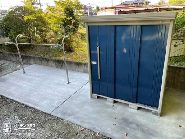 お庭に物置を設置したいとご依頼をいただきました。基礎も土間コンクリートでしっかり作りたいとのことでしたが、物置設置予定場所をちょうど洗濯物を干すスペースとして使われていたので、コンクリートテラスを作ることをご提案。収納作業がしやすいように物置サイズよりも広くコンクリートを打設したほか、物干し台ごと基礎に埋めて、洗濯物を安全に干せるようになりました。強風でも竿が倒れることなく、多少洗濯物が落ちても洗い直さずに済みます。