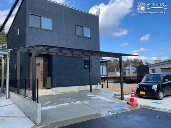 新築のお住まいの外構工事をご依頼いただきました。接道部分から建物まで土間コンクリートを打設し、アプローチ兼駐車スペースに。打設面に合わせてカーポートも設置していますので、お車から玄関まで雨に濡れることなくご帰宅できます。またお庭側はお隣よりも高い位置にあるため、目隠しフェンスで囲って安全対策をしました。プライベート性も高まり、安心してお庭で過ごすことができます。