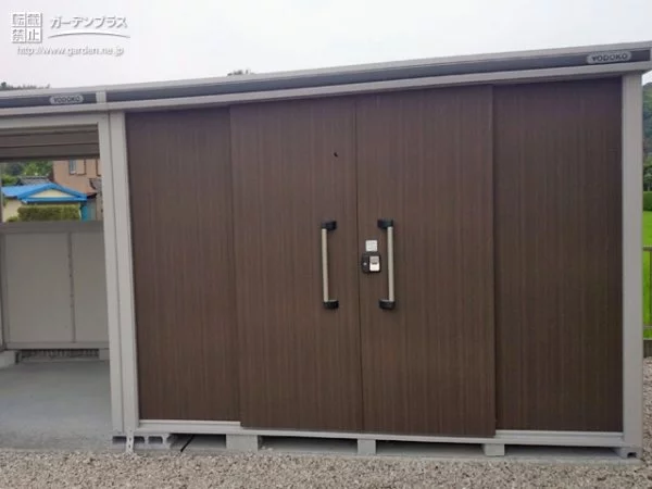 木目調ガルバリウム鋼板のオープンスペースがついた便利な物置設置工事