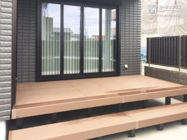 テラスにウッドデッキを設置しました。段床をつけて広々とした空間を演出。優しい木目で癒される、癒しのウッドデッキに仕上げました。