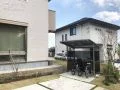 新築外構工事一式を承りました。奥が吹き抜けた駐車スペースには美しいガラス張りのテラス屋根を設置。スタイリッシュな印象の車庫にショールームのようなガラス窓が加わり、お客様自慢の愛車を美しく彩ります。テラス屋根下には人工芝で緑をプラス。雨の日は洗濯スペースに、晴れた日はご家族の憩いの場として多用途にお使いいただけます。