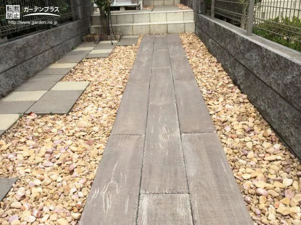 古くなった既存の枕木の取り替えを承りました。木目の加工を施したコンクリート製の枕木をチョイス。腐食や木割れによるささくれの心配もなく、安全に通行できます。天然木のような古木感の枕木がノスタルジックな雰囲気を演出し、森の小道を思わせる仕上がりにいたしました。