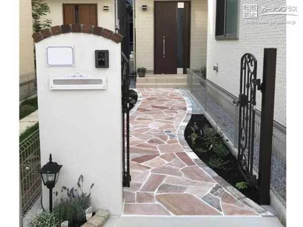 ローズベリーのランダム模様の天然石が、個性豊かなお庭のアプローチとなっています。