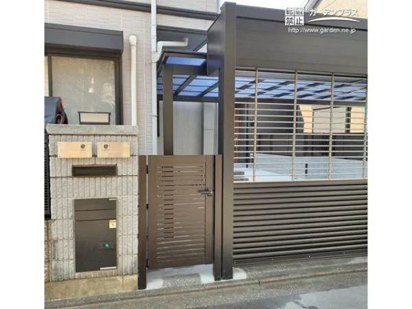 外構のリフォーム工事がしたいとお客様からご依頼いただきました。隣の敷地を購入されたため、駐車スペースを拡げることに。既存の境界ブロックを撤去し、フラットにした後土間コンクリートで舗装しました。お車2台分の空間を確保し、広々と利用していただけます。さらに敷地境界線に新しく目隠しフェンスを施工し、プライベートスペースが生まれました。またカーポートやシャッタゲートでセキュリティ性をプラス。さらに門柱や門扉を新たに新設し、クローズ化しました。お住まいに重厚感や安心感をもたらすクローズ外構工事です。
