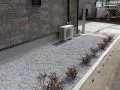 新築のお住まいの外構工事をご依頼いただきました。南面に広いお庭スペースがあり、西側が道路に接した敷地でした。まずは南西部分に2台用の駐車スペースとアプローチをレイアウト。建物まわりは草むしりが負担にならないように防草シートと砂利を敷設しましたが、道路沿いには越境を防ぎながらお庭らしい彩りを兼ねられるようにサツキを植込みました。剪定や水やりの手間はありますが、低木で生長がゆっくりの樹木を選べば管理しやすく、街並みの緑化にも貢献できます。