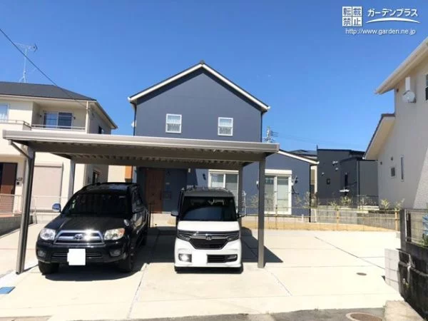 駐車スペースを中心に、外構のリフォームを承りました。砂利敷きだった駐車スペースには土間コンクリートを打設。力強さが魅力の折板カーポートを設置して、強風などの自然災害に備えました。