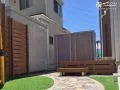 新築のお住まいの外構工事をご依頼いただきました。南側の広いお庭はお車が停められるように土間コンクリートを打設し、目隠しフェンスやタイルデッキを設置。お車とお部屋との行き来もしやすく、空きスペースで洗濯物を干したり自転車を停めることもできるお庭にしました。また道路と近い玄関前には、目隠しも兼ねてL字型の門柱と木目の美しいスリットフェンスを施工。お住まいに使われているダークブラウンや木目デザインと合わせ、シックで一体感のある門まわりに仕上げました。