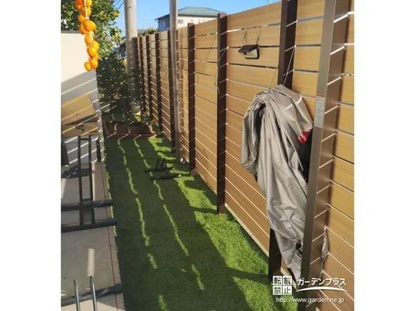 木目調の横板を用いやわらかな印象に整えた目隠しフェンス工事