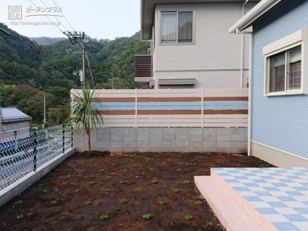新築外構一式工事を承りました。薄い水色のアメリカンな建物に合わせて、パステルカラーのタイルデッキを設置。チェック柄にデザインを配置して、ポップでカジュアルに仕上げました。目隠しフェンスにも同系色を使い、一体感を演出しています。