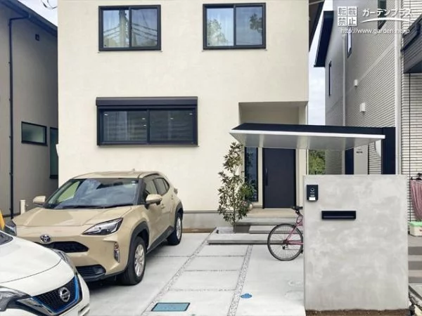 新築外構一式を承りました。駐車スペースからアプローチにかけて土間コンクリートで舗装し、多目的に利用できるように整えています。スリットの白砂利が爽やかなアクセントになりました。門柱はモルタル左官仕上げでモダンに仕上げ、背面に駐輪場を設けています。意匠性の高いサイクルポートが門周りの雰囲気に調和し、白と黒のコントラストがスタイリッシュな印象に。さらにアプローチのフロート階段の広々とした踏面と高低差の少ないデザインは、小さなお子様やベビーカーが行き来しやすい設計になっています。コンクリートやモルタルの無機質さを楽しめるおしゃれな新築外構が完成しました。