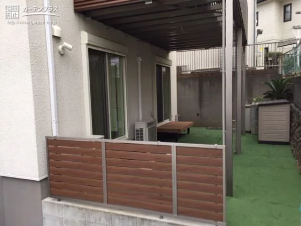 バルコニーデッキの下のお庭をリフォームさせていただきました。防草シートと人工芝を敷設し、テラスにはウッドデッキを設置。また、道路から丸見えにならないよう、目隠しフェンスも設置。日当たりが悪くても緑のお庭を楽しんでいただけるリフォームです。