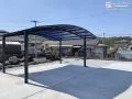今回はカーポートの設置工事を行いました。大きな屋根が特徴的で、青い屋根とシルバーの柱が駐車スペースのデザインと調和していてさわやかな印象になっています。