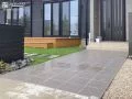 新築のお住まいにタイルデッキを設置したいとご依頼をいただきました。まずは下地としてコンクリートブロックで躯体を作り、デッキ天面や側面には300角のタイルを貼って仕上げています。ステップも1段追加しました。タイルは高級感のある見た目ももちろんですが、熱や汚れに強い機能性も魅力の舗装材で、もし割れても1枚を交換するだけでいいのでメンテナンスが楽です。窓のサッシの近くにグレーチングを入れることで、室内の床に近い高さのデッキになり、行き来が楽になりました。