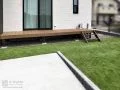 新築のお住まいの外構工事をご依頼いただきました。前面道路に勾配がある敷地のため、建物向かって左から右手に勾配があり、手前から奥に向かっても勾配のある角地です。まずは擁壁上にお庭スペースを取り、人工芝や花壇を施工しました。掃き出し窓には大きなウッドデッキも設置。お子さまが走り回って緑を楽しめるお庭になりました。また、駐車スペースやアプローチには、土間コンクリートを打設して、緩やかなスロープ状に。法面のお庭からお車の出し入れをスムーズに行えるよう設計しました。