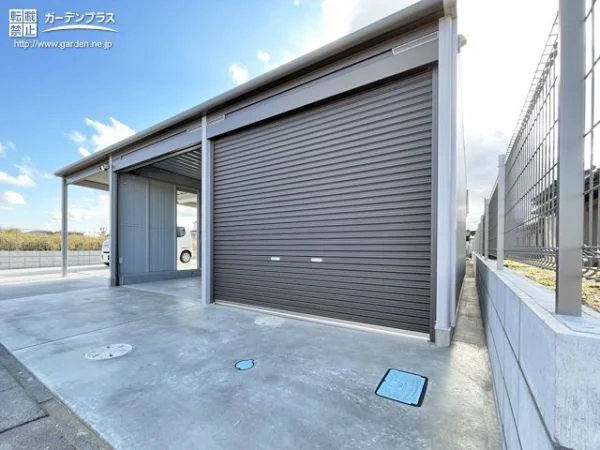 1期工事でタイルデッキや境界フェンスの施工をさせていただいたお住まいの、2期工事としてファサードの工事をご依頼いただきました。駐車スペースには、お客様のご希望により、ユニットを連結できるシャッターガレージを設置。ガレージ内に2台、オープンスペースに1台格納できます。足元は土間コンクリートで舗装しているため、スムーズに行き来でき、泥はねなども気にならないように配慮しました。またアプローチまでの動線上にも、土間コンクリートを打設し、アクセントにインターロッキング目地を配置しています。使い方の幅が広がりセキュリティ性の高まる、ガレージ付きのファサードとなりました。