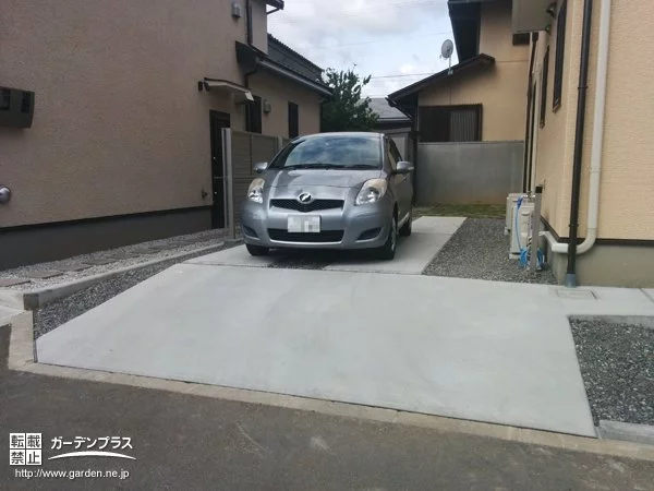 砂利が敷かれていた駐車スペースに土間コンクリートを打設しました。泥はねや水たまりが少なくなるほか、勾配のあるスペースなので砂利が溝に落ちる心配もなくなります。目地は人工芝を敷き詰めたので、雑草も少なく、グリーンのコントラストが映える駐車スペースです。