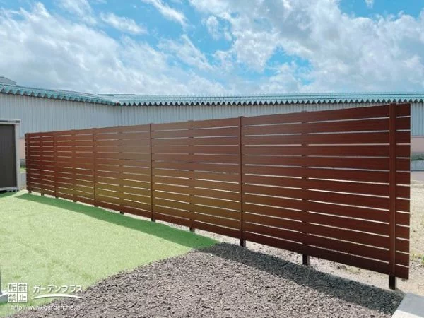 人工芝とのコントラストが美しい木目調目隠しフェンス設置工事