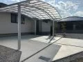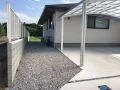 カーポートや目隠しフェンスの設置がしたいと、お客様からご依頼いただきました。駐車スペースは砂利敷きでしたが、駐車の際に砂利が散らばってしまったりと不便だったことから、土間打ちに。頭上には片流れタイプのカーポートを設置しました。真っ白なフレームに透過率の高い屋根材を組み合わせていただき、明るさを遮らない開放感のある仕上がりとなっています。またお庭を囲んでいた境界フェンスを撤去し、お庭で洗濯物を干す際も安心できるよう、目隠しフェンスを新設しました。ホワイトのエクステリアが明るく爽やかな雰囲気を演出してくれるリフォーム工事です。