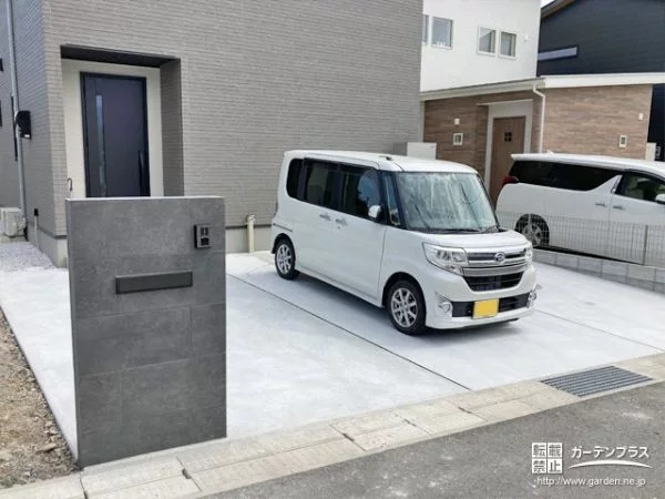 新築外構一式を承りました。グレーの外壁でモダンなお住まいに合わせた外構をプランニングしています。まず駐車スペースは、お車2台分を駐車できるよう土間コンクリートを打設しました。ファサードをフラットに仕上げることで多目的に利用できます。接道部にはシックなタイルで仕上げた、高級感のある造作門柱を施工しました。また、犬走りに防草シートと白砂利を敷設。外構を明るいカラーでまとめているため、モダンな門柱が目を引くデザインの新築外構になっています。