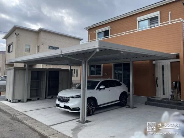 新築のお住まいに、カーポートや物置の設置工事をご依頼いただきました。お車2台分の駐車スペースに対して、カーポートは2台用+αの余裕のある屋根サイズをご提案し、アプローチも雨に濡れずに通っていただけます。また物置の扉が屋根の下に位置するように調整し、雨の日でも収納作業がしやすいようにしました。その他隣地境界には、メッシュフェンスも設置しています。頑丈で大きなカーポートが、お車はもちろんご家族のご帰宅時も守ってくれるエクステリア設置工事です。