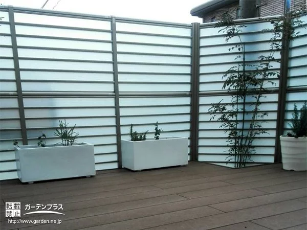 間口の広いウッドデッキと、目隠し機能を保ちつつ採光性と採風性を確保したフェンスが綺麗に納まり、素敵なお仕上がりとなりました。