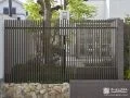 門まわりをリフォームしました。既存の門柱や門扉は撤去。門柱と門袖には複雑な凹凸を持つダークグレーのボーダータイルを使い、繊細でモダンな印象に仕上げました。門扉にはお庭内部が見えない重厚な木目調デザインを用いて、格調高さをプラスしています。