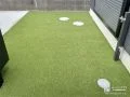 人工芝と石材のコントラストが映える前庭と駐車スペースの工事