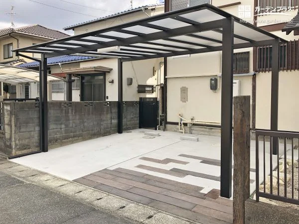 新築のお住まいの外構工事を承りました。お車2台分の駐車スペースを確保して、足元には砂利を敷き、タイヤの轍部分に土間コンクリートを打設。2台分のお車をすっぽりと覆うカーポートも設置して、雨の日でも乗り降りしやすい駐車スペースが完成しました。アプローチには、モノトーンカラーの平板を使い、市松模様が美しいインターロッキング舗装に。玄関前に造作した花壇でお庭に植栽の彩りを加えました。スマートな印象を与えるエクステリアを採用し、お庭まわりをモダンに整えた新築外構工事です。