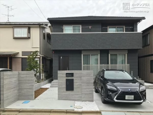 シックなグレーのお住まいに合うよう、無彩色を基調とした外構をご提案しました。門柱は施工の難しい杉目板コンクリートを再現したタイルを使い、モダンでスタイリッシュな雰囲気に。アプローチ脇やテラス前はガーデニングを楽しめるよう、植栽スペースを設けました。建物周りも境界塀の設置や雑草対策工事など、生活しやすいよう整えています。