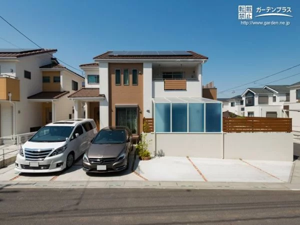 透き通るようなクリアブルーのパネルが目を引く新築外構一式工事
