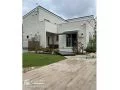 新築のお住まいの外構工事を承りました。駐車スペースは土間コンクリートを打設し、犬走りなど建物周囲は防草シートと砂利を敷き詰めました。玄関前には木調のスマートな機能門柱も設置しています。広々とした敷地に似合う、開放的な外構に仕上げました。