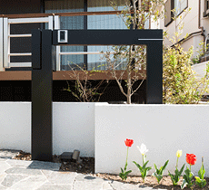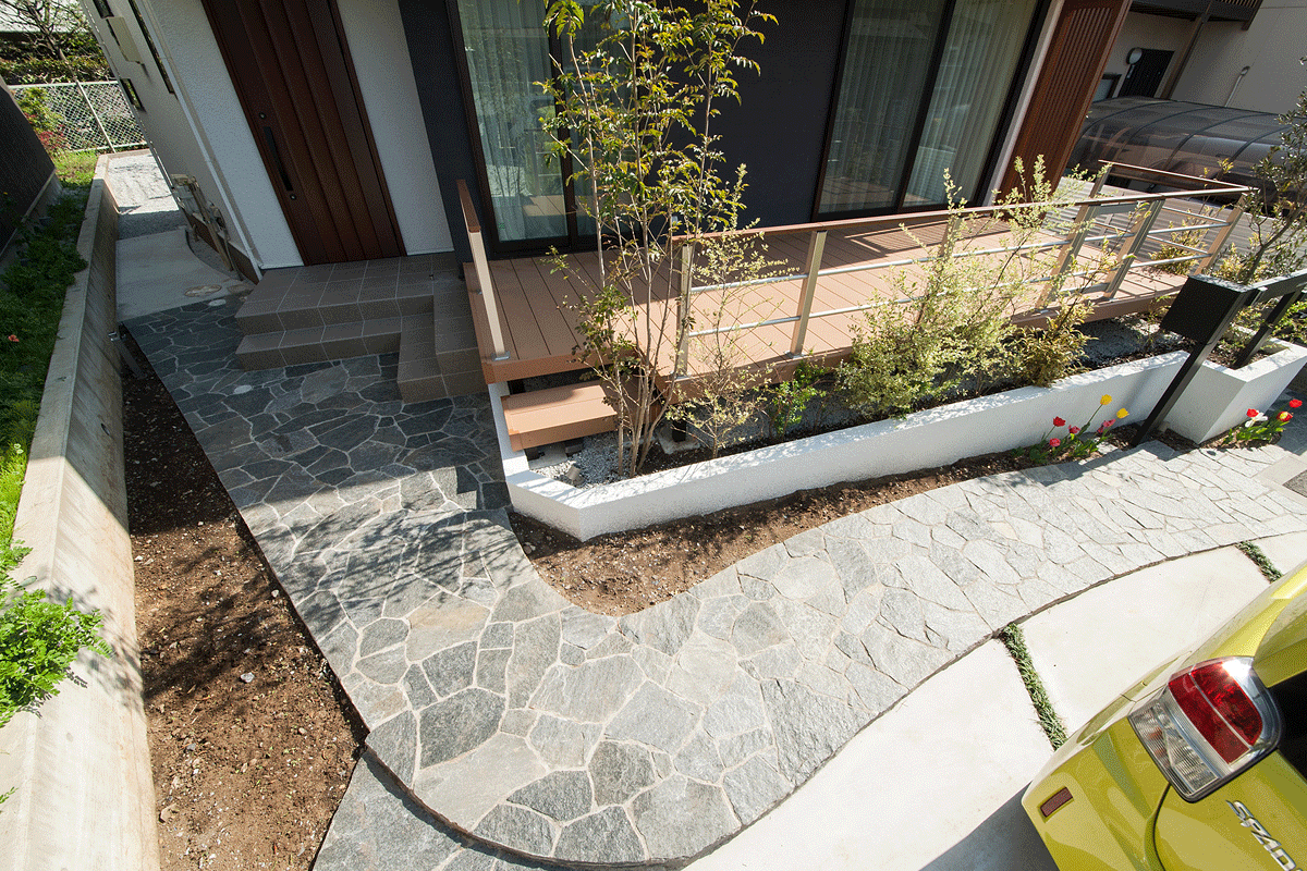 ウッドデッキ YKKAP リウッドデッキ 門柱 オンリーワン Styling Frame アプローチ乱形石 エスビック ジャワ鉄平 土留め ジョリパット仕上げ デッキフェンス YKKAP ルシアス デッキ門扉 YKKAP ルシアス門扉 - 施工金額:360万円