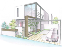 鮮やかな緑溢れる植栽や咲き乱れるお花が、訪れる人の心を癒す玄関まわり。ボリュームに配慮してアクセント程度に植物を配置することで、開放感も感じられる明るい玄関まわりに仕上がります。目隠しのフェンスにはつる状の花を植え、エクステリアと植栽が一体となったデザインに。明るく優しい雰囲気のお庭が来る人の目と心を楽しませます。